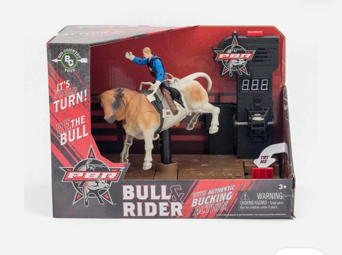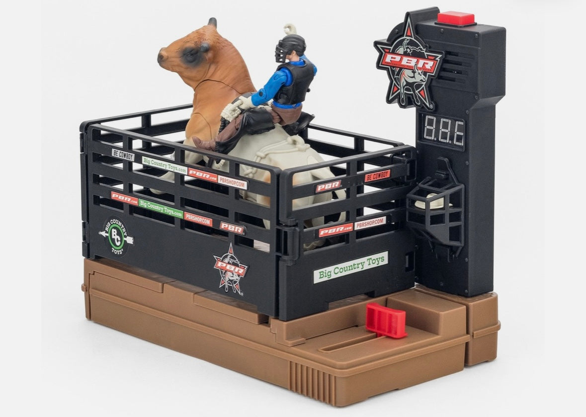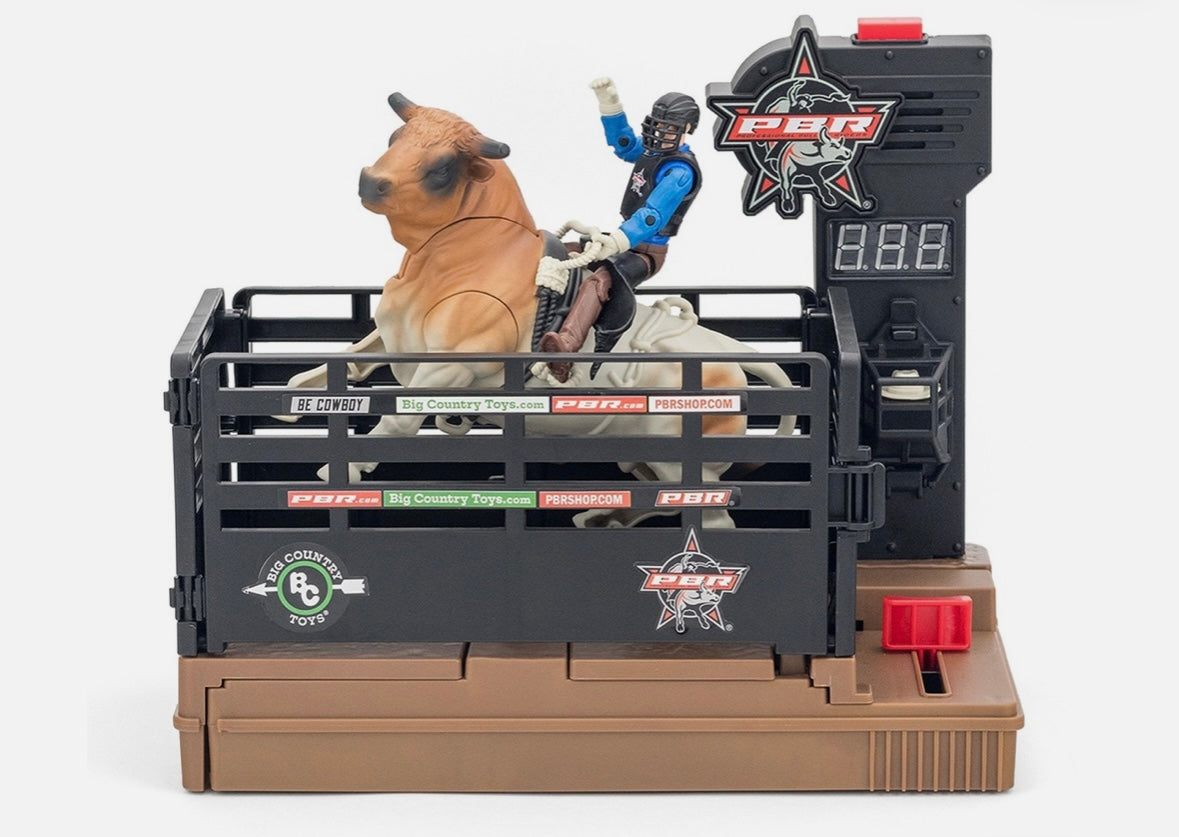 Take your PBR toys to the next level with our authentic bucking bull and rider toy! With the push of a button, the chute gate flings open, the timer starts, and the ride is on - try to buck the rider off before the timer strikes 8 seconds. A first of it's kind, this interactive playset features authentic bucking action, an 8-second timer, crowd noise, and play-by-play announcer audio. With interchangeable bull and rider with helmet and cowboy hat, the thrill of the Professional Bull Riders is limitless!