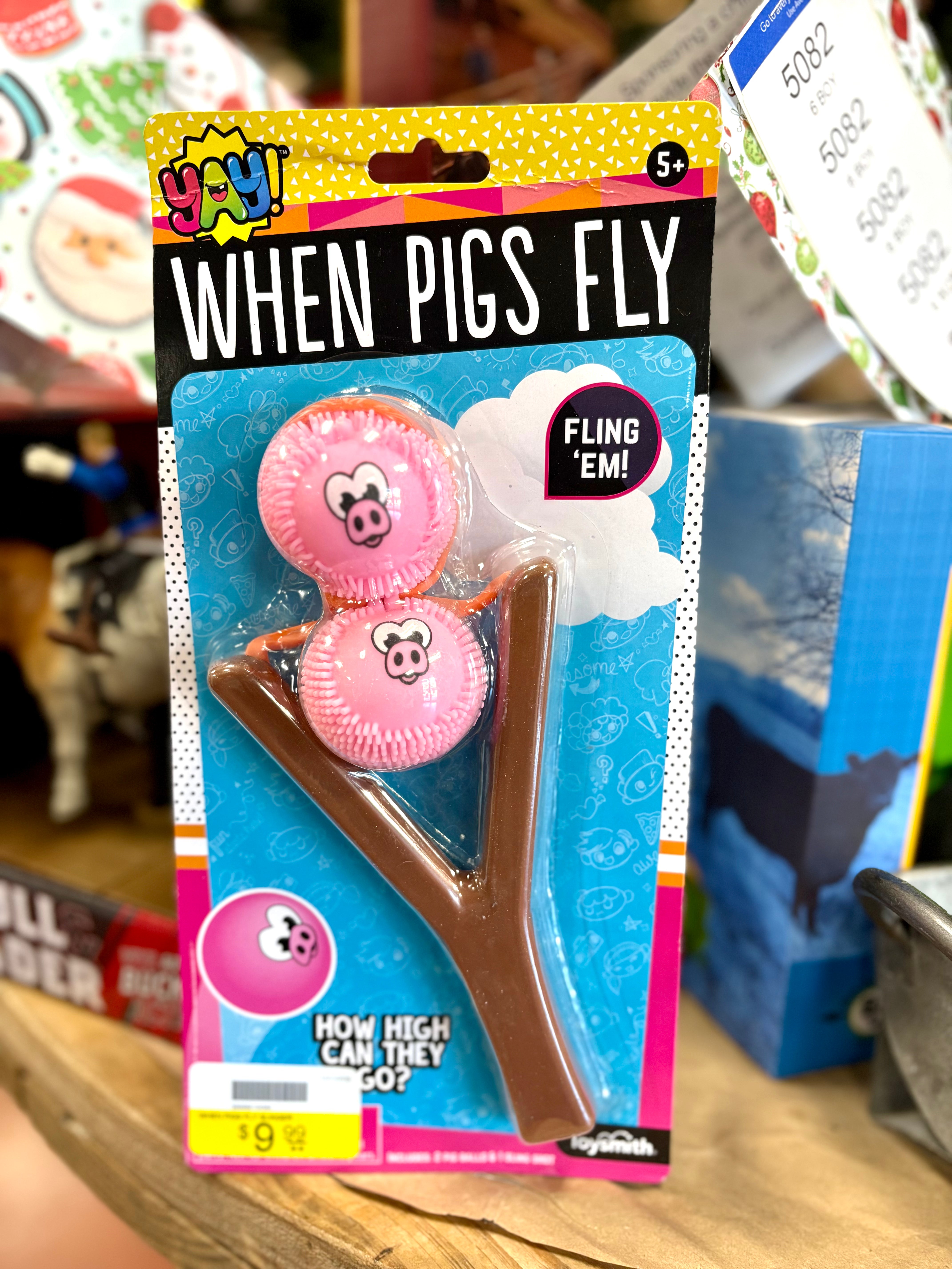 MUnleash flying fun with the When Pigs Fly Slinger! This playful slinger sends flying pigs soaring, taking fun to new heights. No need to take yourself too seriously with this quirky and entertaining toy. (Warning: may cause uncontrollable laughter and endless smiles.)